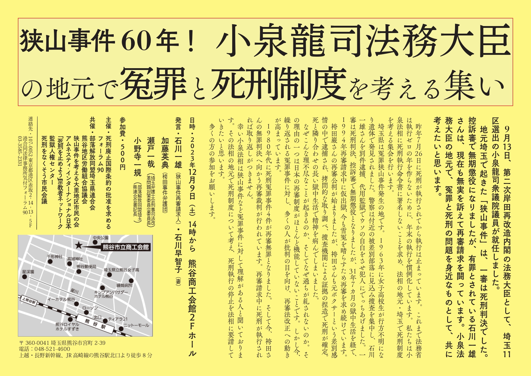 狭山事件60年! 小泉龍司法務大臣の地元で冤罪と死刑制度を考える集い