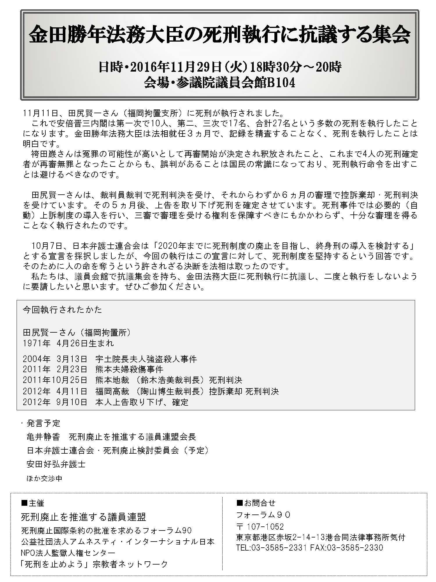 私たちは、議員会館で抗議集会を持ち、金田法務大臣に死刑執行に抗議し、二度と執行をしないように要請したいと思います。ぜひご参加ください。